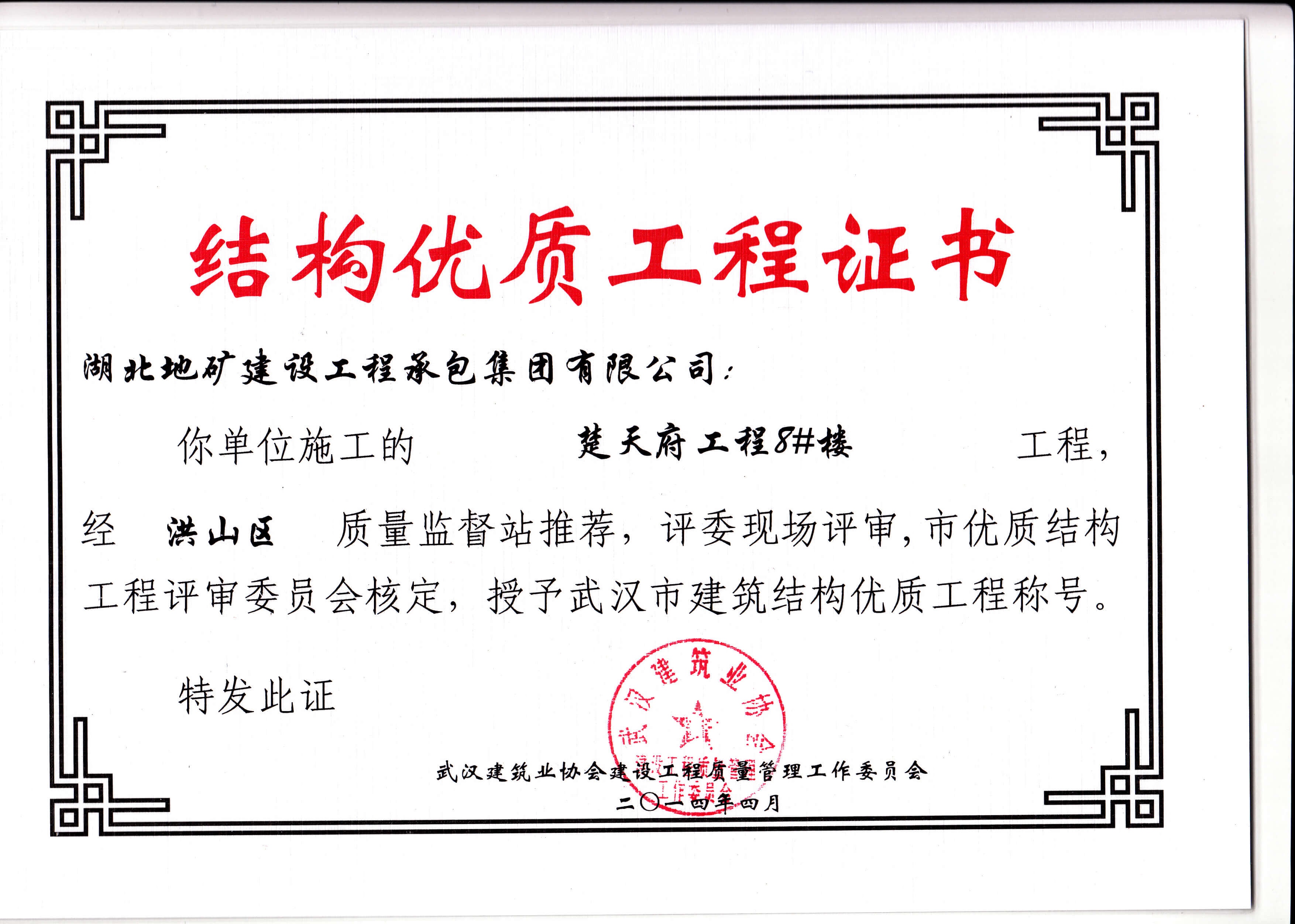 承包公司楚天府8#樓武漢市建筑結(jié)構(gòu)優(yōu)質(zhì)工程