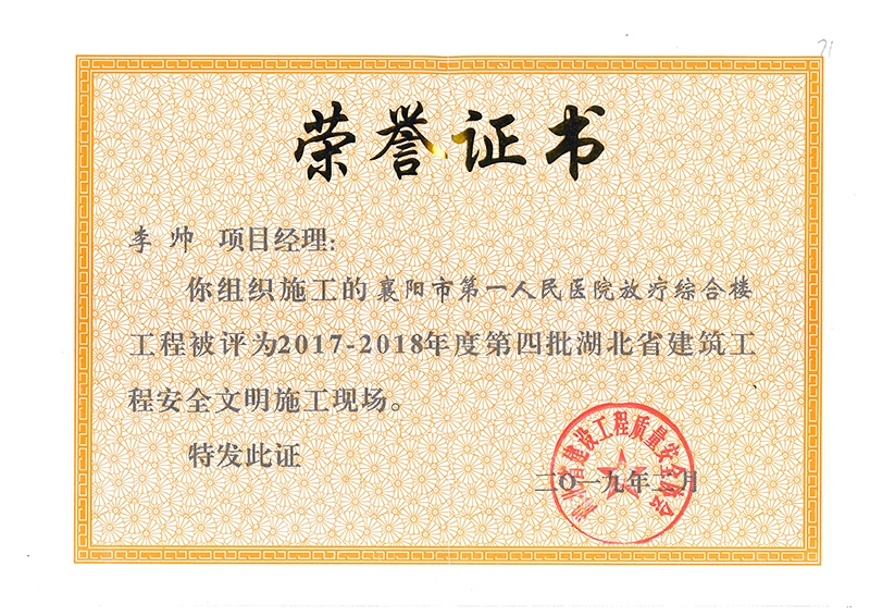 襄陽(yáng)人民醫(yī)院項(xiàng)目經(jīng)理被評(píng)為湖北省建筑工地安全文明施工現(xiàn)場(chǎng)