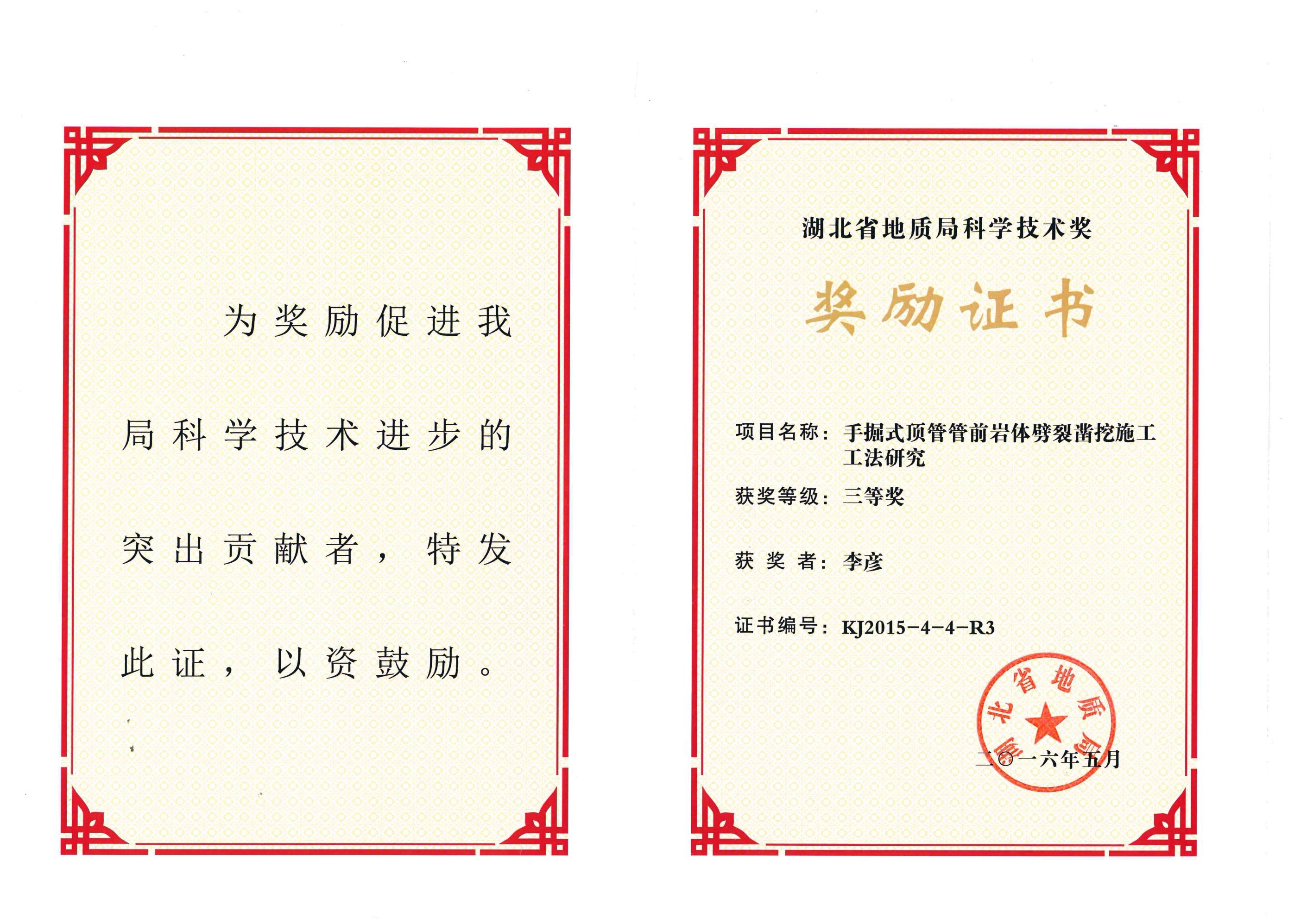 手掘式頂管管鉗巖體劈裂鑿?fù)谑┕すしㄑ芯揩@得湖北省地質(zhì)局科學技術(shù)三等獎(李彥)