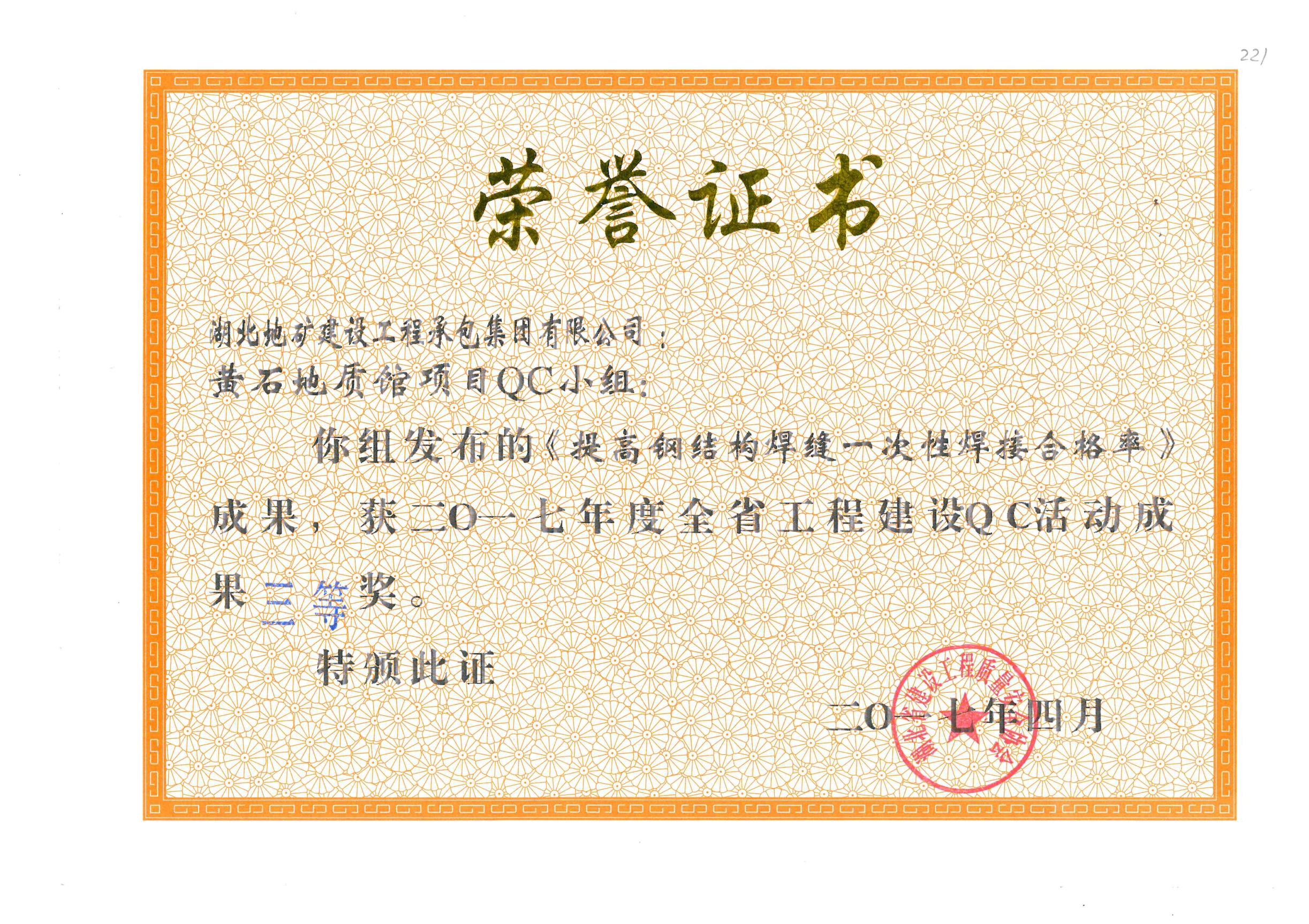 黃石地質(zhì)館《提高鋼結(jié)構(gòu)焊縫一次性焊接合格率》獲得QC成果三等獎