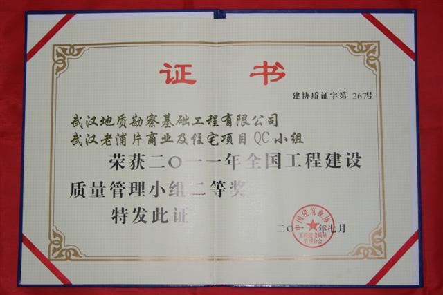 8月3日,在銀川舉行的2011年全國工程建設(shè)優(yōu)秀QC成果發(fā)布暨評審會上,武基公司武漢老浦片商業(yè)及住項目QC小組榮獲2011年度全國工程建設(shè)質(zhì)量管理小組二等獎。