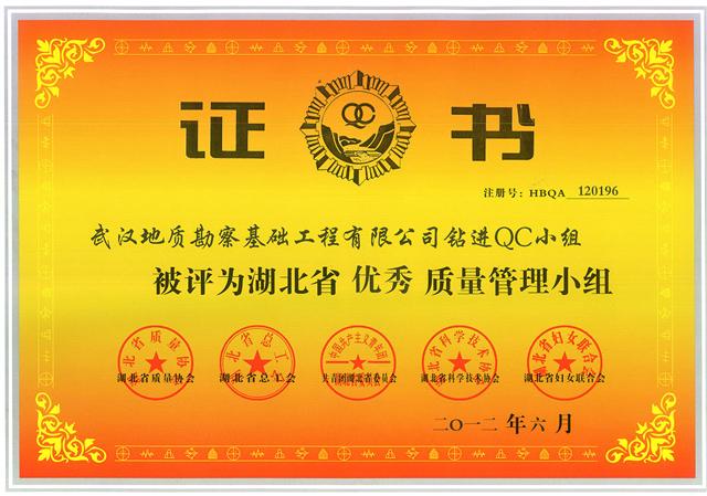 武基公司鉆進(jìn)QC小組《提高旋挖鉆機(jī)嵌巖施工效率》成果被評(píng)為二等獎(jiǎng),勘察公司礦山環(huán)境治理QC小組《提高高陡巖石坡面客土噴播綠化覆蓋率》成果被評(píng)為三等獎(jiǎng),地建承包公司新星小組《附著式升降腳手架安全防護(hù)新工藝施工》被評(píng)為優(yōu)等獎(jiǎng)。武基公司鉆進(jìn)QC小組、勘察公司礦山環(huán)境治理QC小組和地建承包公司新星小組均被評(píng)為“湖北省優(yōu)秀質(zhì)量管理小組”。