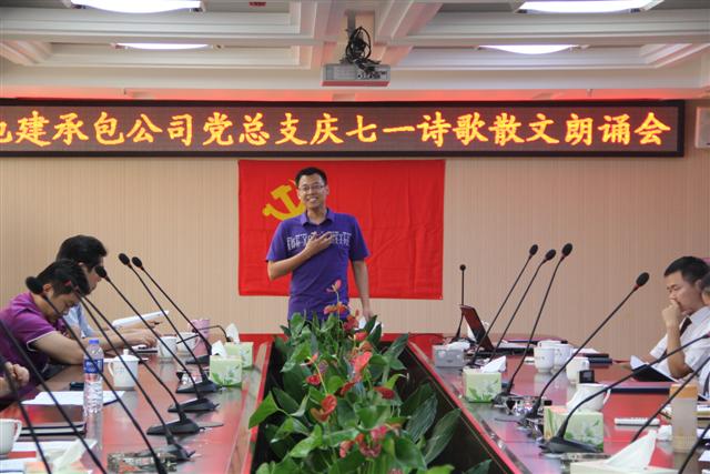 為了慶祝建黨91周年,地建承包公司黨總支于6月29日下午在公司13樓會(huì)議室成功舉行了“迎七一”詩歌散文朗誦會(huì)。院黨委委員、副院長史立京和地建承包公司50余名機(jī)關(guān)工作人員、黨員參加了朗誦會(huì)。