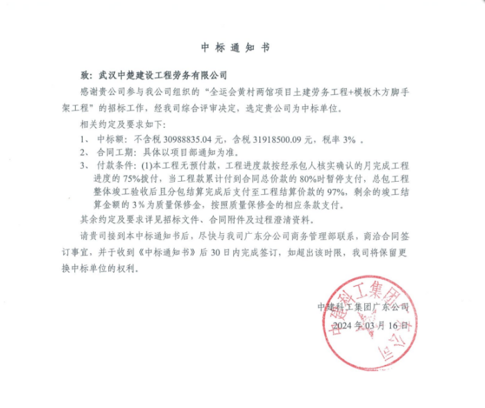 2024年,公司堅持經(jīng)營創(chuàng)新,織密內(nèi)合外聯(lián)“互聯(lián)網(wǎng)”,不斷加強(qiáng)與大型央企國企等優(yōu)質(zhì)客戶緊密協(xié)作,與中建科工、中建三局公司建立戰(zhàn)略合作關(guān)系,大力開拓廣州區(qū)域市場,近日成功中標(biāo)全運會黃村兩館項目土建勞務(wù)+模板木方及架體搭設(shè)項目、康王路隧道安置房項目樁基礎(chǔ)及基坑支護(hù)工程,合同金額共計約4000萬元。全運會黃村兩館項目是中楚公司全面參與建筑勞務(wù)市場化競爭的里程碑項目,康王路隧道基礎(chǔ)項目是公司進(jìn)一步拓展廣東地域市場的項目,相關(guān)項目對公司轉(zhuǎn)型發(fā)展及市場布局具有重要意義。