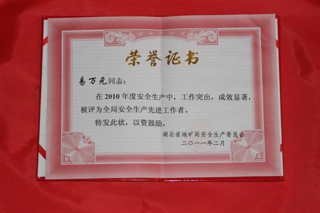 2011年3月4日,省地礦局召開 2011年安全生產(chǎn)工作會議。會議對省、局安全生產(chǎn)先進(jìn)單位和個人進(jìn)行了獎勵。武基公司榮獲“省地礦局2010年度安全生產(chǎn)先進(jìn)單位”,公司總經(jīng)理易萬元被評為“省地礦局安全生產(chǎn)先進(jìn)工作者”,獲“全省安全生產(chǎn)先進(jìn)工作者”稱號的武基公司安全科長趙宏偉還以《履行安全生產(chǎn)管理職責(zé),做一名合格的安全生產(chǎn)“守衛(wèi)者”》為題在大會上作了安全工作經(jīng)驗(yàn)交流。