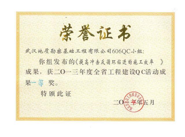 2013年5月,武漢地質(zhì)勘察基礎(chǔ)工程有限公司606QC小組發(fā)布的《提高沖擊反循環(huán)鉆進的施工效率》成果,被湖北省建設(shè)工程質(zhì)量安全協(xié)會授予2013年度全省工程建設(shè)QC活動成果一等獎。