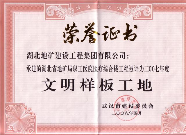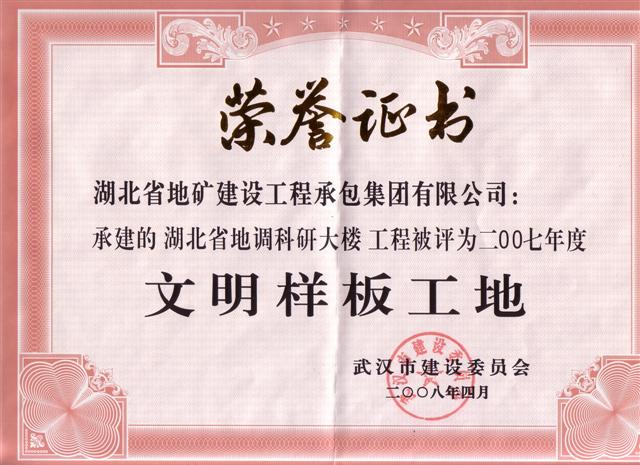 湖北地建地調(diào)大樓項目部和職工醫(yī)院項目部充分貫徹我院把項目現(xiàn)場安全文明施工管理作為打造“湖北地建”品牌的窗口的要求,以嚴(yán)格的現(xiàn)場管理水平、良好的施工技術(shù)質(zhì)量與近日同時榮獲 “2007年度武漢市建筑工程文明樣板工地”稱號;地調(diào)大樓項目經(jīng)理李彥同志和職工醫(yī)院項目經(jīng)理分別榮獲“文明施工管理優(yōu)秀項目經(jīng)理”。