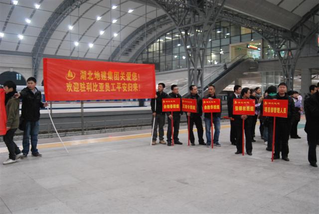 2011年3月3日,湖北地建集團(tuán)最后一批從利比亞撤離人員共62人安全抵達(dá)武漢,湖北省地礦局副局長曾環(huán)宇、辦公室主任李華、財務(wù)處處長張康宇等在地建集團(tuán)總經(jīng)理程立文、黨委書記吳國才、常務(wù)副總經(jīng)理吳賢亮的陪同下,到漢口火車站迎接。