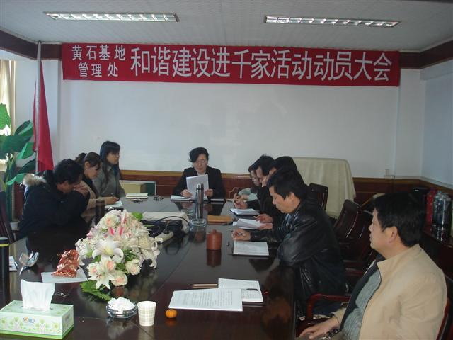 2011年3月25日下午,黃石基地管理處召開了“和諧建設(shè)進(jìn)千家”活動動員大會。會議以“訪民情、辦實(shí)事、化矛盾、促和諧”為主題;以結(jié)合職工實(shí)際、圍繞職工群眾最關(guān)心、最直接、最現(xiàn)實(shí)的利益問題,努力為職工群眾多辦解民憂、謀民利、化民怨的實(shí)事好事為宗旨;圍繞促進(jìn)和諧基地建設(shè),大力開展“送政策、送健康、送服務(wù)、送溫暖”等活動,通過走訪慰問,把黨的關(guān)懷與溫暖送到職工群眾手中。該活動分3個(gè)工作小組,將分別走訪四個(gè)小區(qū),從