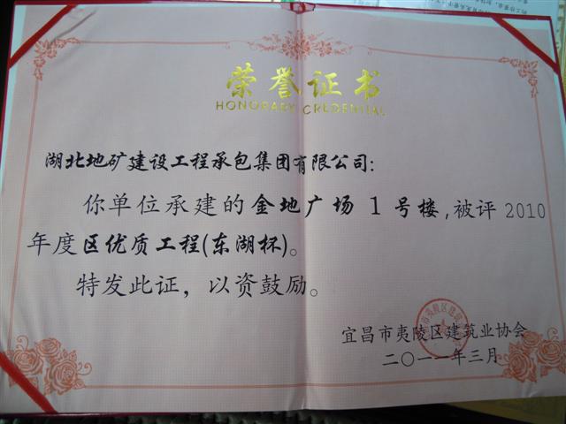 2011年3月31日,夷陵區(qū)住房與城鄉(xiāng)建設(shè)局召開了住建系統(tǒng)2011年度工作會議。會議對2010年度先進單位和個人進行了獎勵。由湖北地礦建設(shè)工程承包公司承建的金地廣場1#樓項目被評為“區(qū)文明施工現(xiàn)場”“區(qū)優(yōu)質(zhì)結(jié)構(gòu)”“區(qū)優(yōu)質(zhì)工程(東湖杯)”,并被推薦為省優(yōu)質(zhì)工程(楚天杯)項目,鄧繼國被評為區(qū)“優(yōu)秀項目經(jīng)理”。夷陵區(qū)住房與城鄉(xiāng)建設(shè)局黨組書記、局長覃萬橋,黨組副書記、副局長何光林,副局長王同林、萬平等領(lǐng)導(dǎo)出席會議并為獲獎單位頒獎。