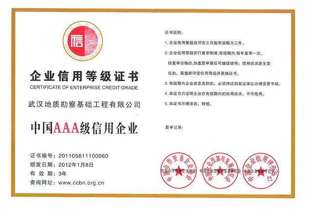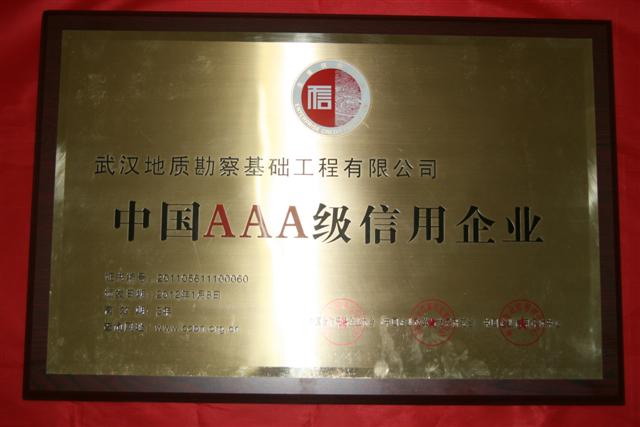 近日,武漢地質(zhì)勘察基礎(chǔ)工程有限公司被中國合作貿(mào)易企業(yè)協(xié)會、中國企業(yè)改革與發(fā)展研究會和全國企業(yè)信用評價中心聯(lián)合授予“中國AAA級信用企業(yè)”榮譽稱號。