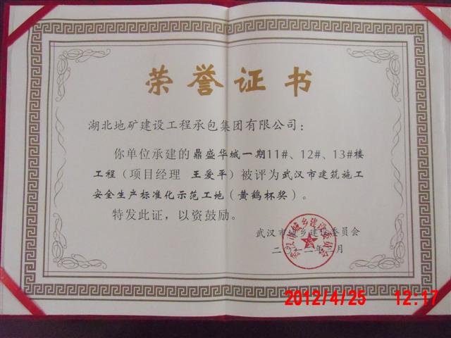 “黃鶴杯”獎是“武漢市建筑施工安全質(zhì)量標(biāo)準(zhǔn)化示范工地”的簡稱,是武漢市建筑行業(yè)工程質(zhì)量的最高榮譽(yù)。此榮譽(yù)的獲得既是對鼎盛華城一期11#12#13#樓項(xiàng)目部前期的安全文明施工工作的肯定,也為該項(xiàng)目部爭創(chuàng)“安全文明施工現(xiàn)場”(楚天杯)獎創(chuàng)造了前提條件。項(xiàng)目部全體管理人員表示將再接再厲搞好后期安全文明施工,爭創(chuàng)更高榮譽(yù)——“楚天杯”獎。