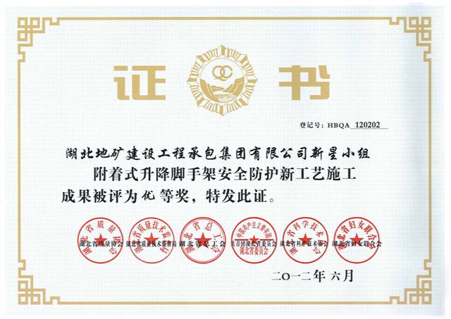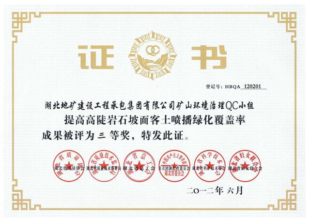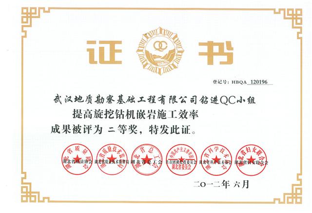 武基公司鉆進(jìn)QC小組《提高旋挖鉆機(jī)嵌巖施工效率》成果被評(píng)為二等獎(jiǎng),勘察公司礦山環(huán)境治理QC小組《提高高陡巖石坡面客土噴播綠化覆蓋率》成果被評(píng)為三等獎(jiǎng),地建承包公司新星小組《附著式升降腳手架安全防護(hù)新工藝施工》被評(píng)為優(yōu)等獎(jiǎng)。武基公司鉆進(jìn)QC小組、勘察公司礦山環(huán)境治理QC小組和地建承包公司新星小組均被評(píng)為“湖北省優(yōu)秀質(zhì)量管理小組”。