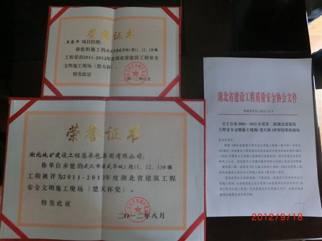 作為地建承包公司的一個(gè)文明施工窗口,該工程項(xiàng)目部通過良好的管理、有效的措施和科學(xué)合理的施工安排滿足了文明施工、環(huán)境保護(hù)、現(xiàn)場安全防護(hù)、擾民控制、材料設(shè)備進(jìn)出場以及政府部門對施工管理的相關(guān)要求,接受了來自建設(shè)、施工、監(jiān)理、政府等部門對項(xiàng)目現(xiàn)場進(jìn)行的全方位考評(píng),得到了各方好評(píng),并最終獲得了這項(xiàng)湖北省建筑行業(yè)安全文明施工的最高榮譽(yù)。